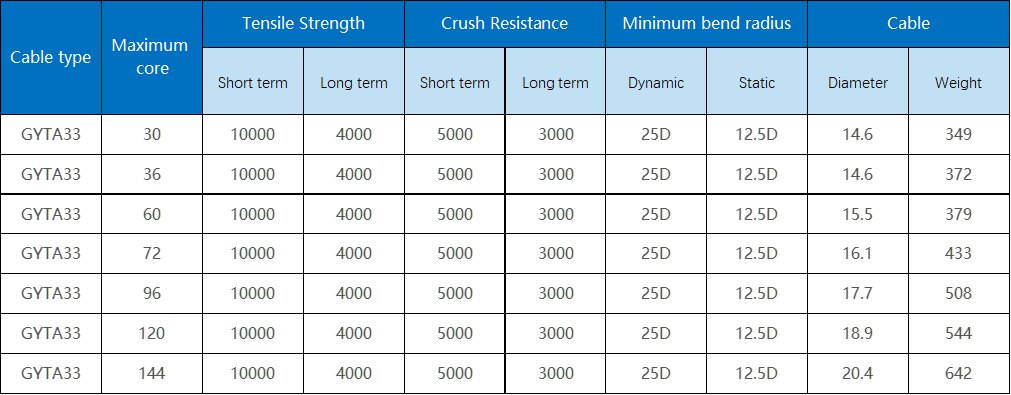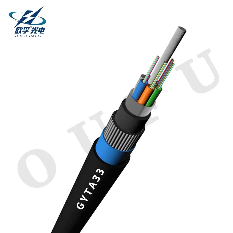 Fiber optic cable GYTA33, 2~72 fibers, central strength member (steel), jelly-filled, fiber contained loose tube and pp filler (if necessary) stranded, water blocking jelly, copolymer coated aluminum tape, pe inner sheath, arИҳарак иҳатd by a layer of steel wires, pe outer sheath. G652d sm fiber, detailed specification on your request.